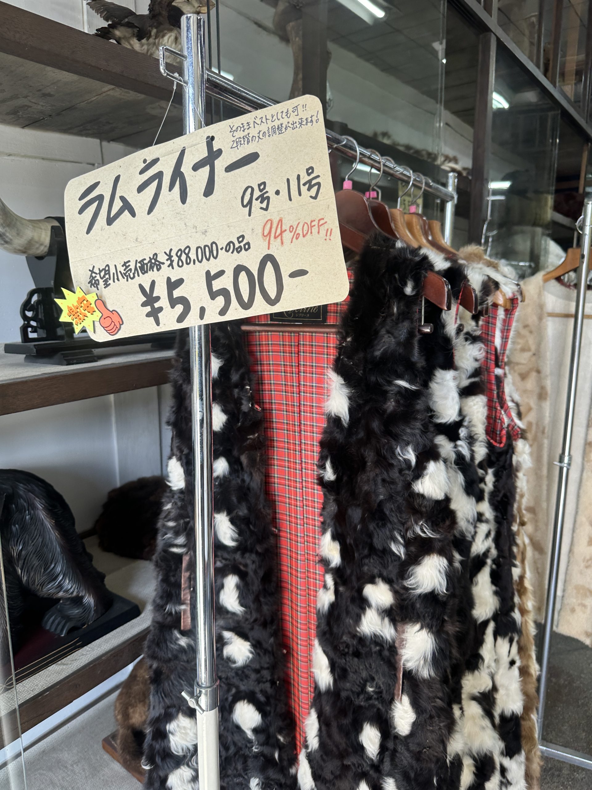 何だと思います? これはポシェットでした。店内のあらゆるところに、気になる革製品が、あるあるあるあるある。 袖なしのベスト、コート、襟巻き、装飾系、動物の剥製