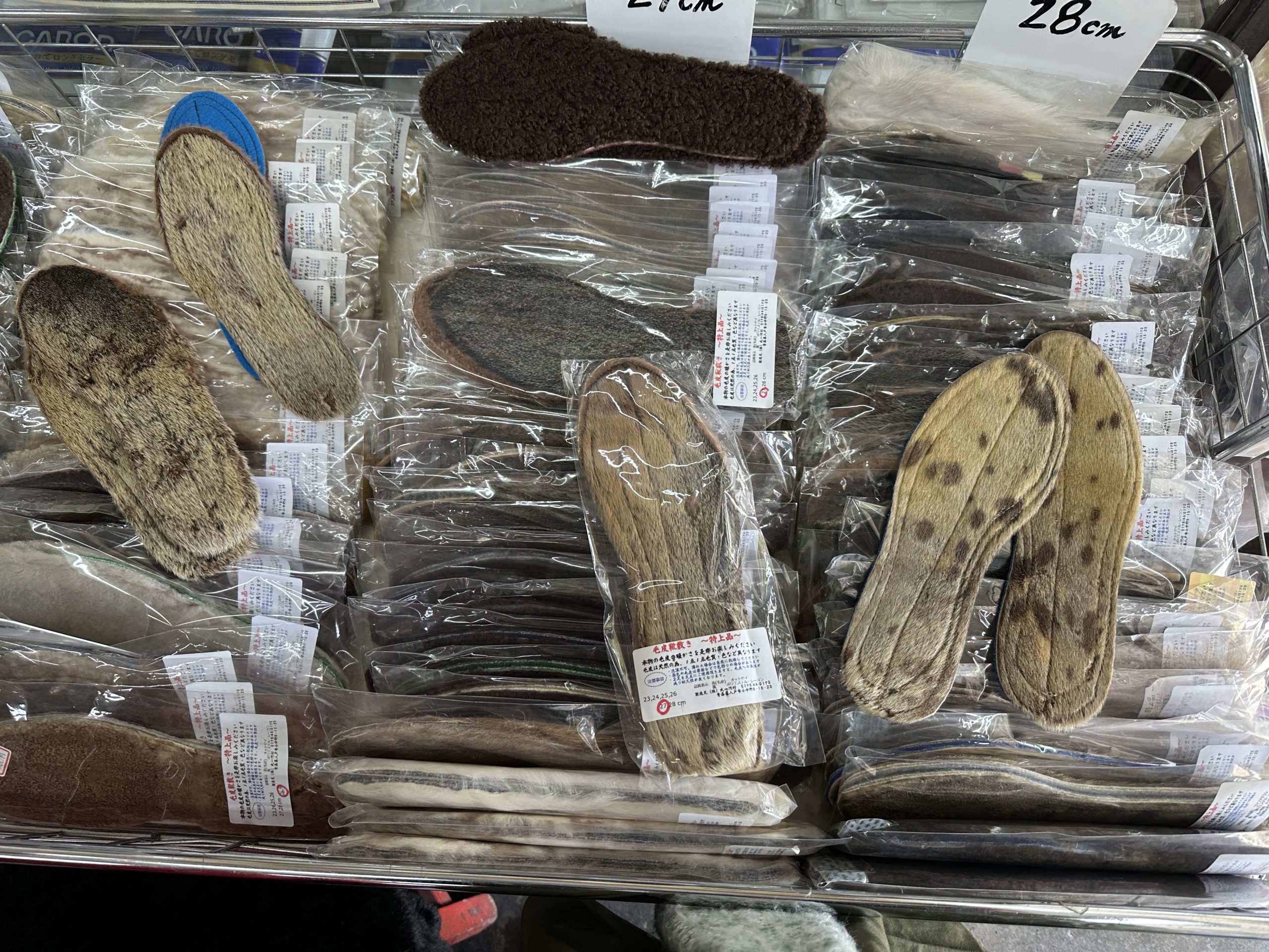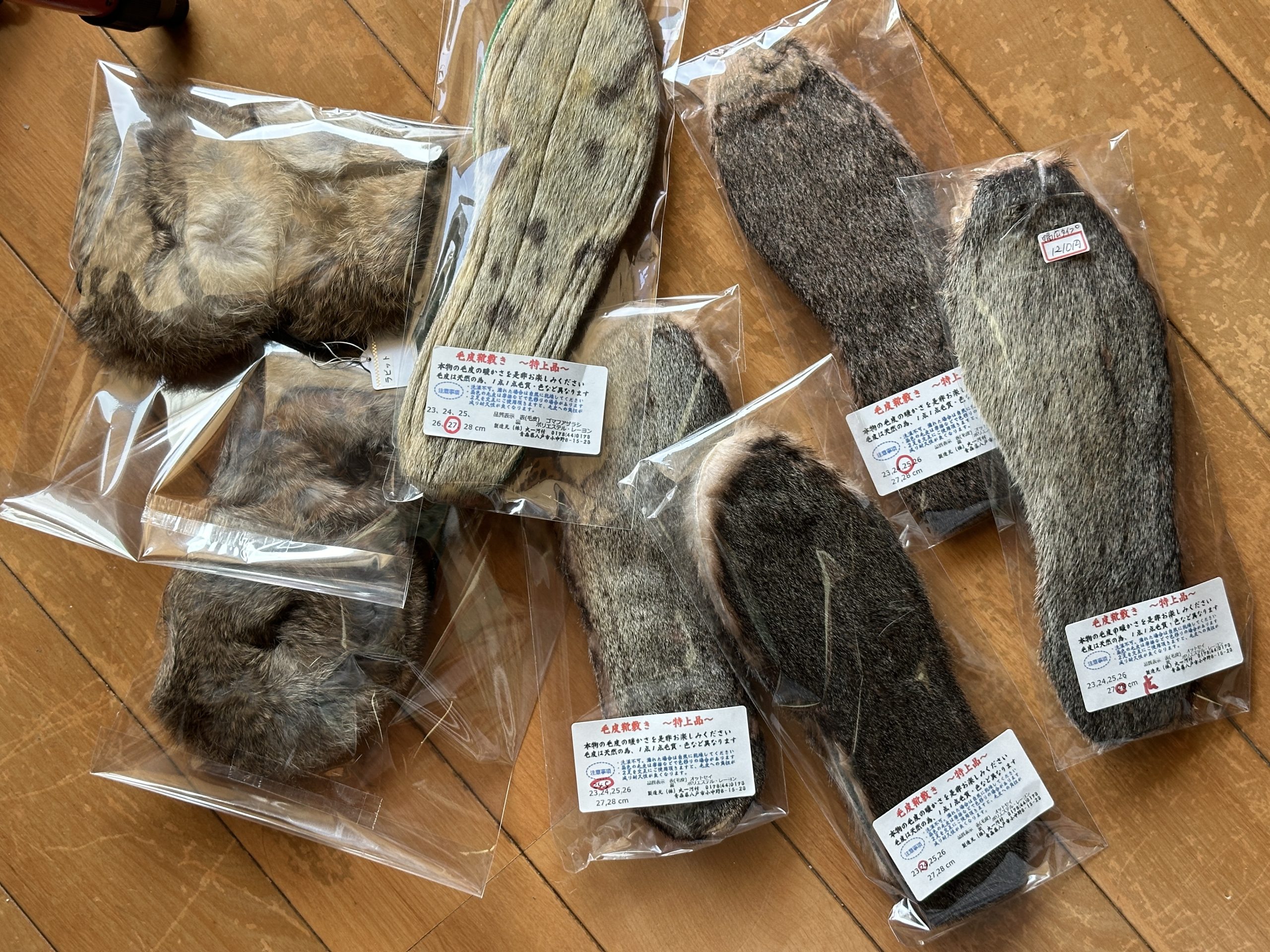 こちらは目玉商品の『中敷』しかも、オットセイ!(左列の2足と中央下から2足)毛並みの短いものは夏場に素足で履いても通気性が良いらしいです!右側の斑点模様があるのが、ゴマフアザラシ。