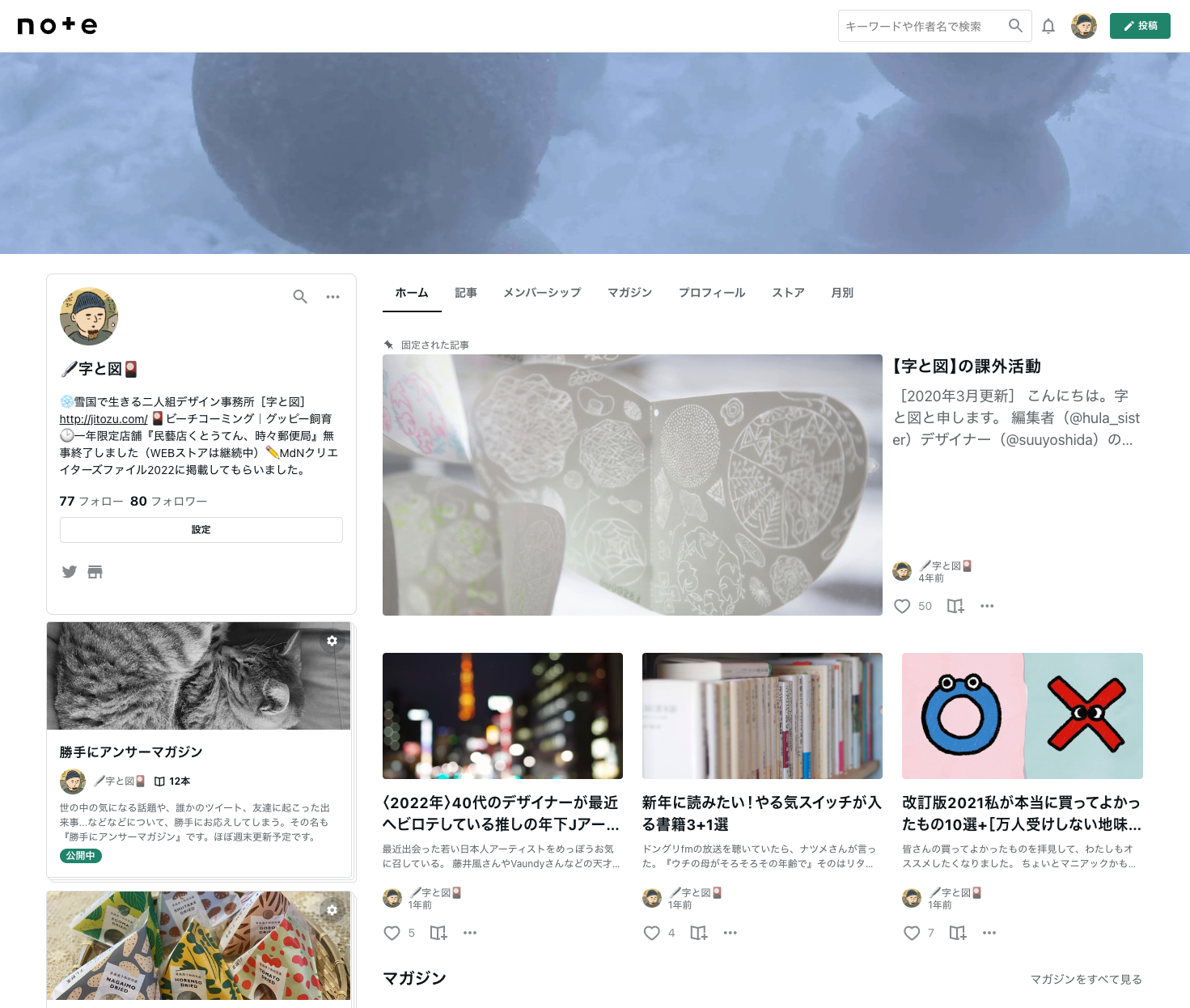 info noteはじめました jitozu_zu 2020年5月12日 / 2025年2月4日 note(ノート)外部リンク字と図|notehttps://note.com/jitozu雪国で生きる二人組デザイン事務所[字と図]http://jitozu.com/ 趣味: ビーチコーミング|グッピー飼育 ▶︎一年限定店舗『民藝店くとうてん、時々郵便局』を無事終了しました(BASE ストアは継続中) 字と図の専用noteをはじめました。 私たちのことを知らない方々に向けて、noteというプラットフォームを使って、 発信しようと考えました。 字子さん 何を書くの? 図郎さん このサイトとは一味違った、デザインにまつわる記事かな… ノラさん ぜひ読んでニャ! 《関連する記事》ある日の #奥入瀬渓流 #渦 を巻く木『灯台もと暮らし』さんによる十和田特集(2017年7月開始)にともない字と図が取材されました新しい作品をアップしました!『ハーモニーカレンダー2013』在宅ワーカー必見!デスクワークにつきもの原因不明の偏頭痛が嘘みたいに治るたった2つの方法はるばる海を渡って #美味しい モノと #美しいモノ がやってきた #ピーナツ黒糖 #味付落花生 #宮古 #焼物 #陶器 #沖縄 #2000km ぐらい?画面が真っ黒になったら空間がOFF化した猫の飼育に最低限必要なもの庭の竹から #七夕 用の笹を拝借サイトマップ醸し人“九平次”の純米大吟醸やっぱりうまい暑い夏には体感温度が下がるかも!?ARうちわ7月7日 新しいコミュニティデザインを考える – 第1回『地域に向けてクリエイターができること』