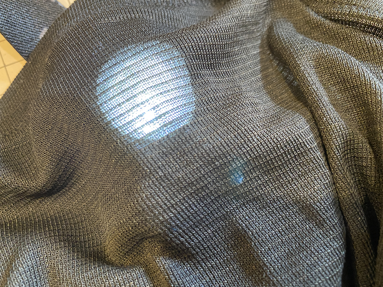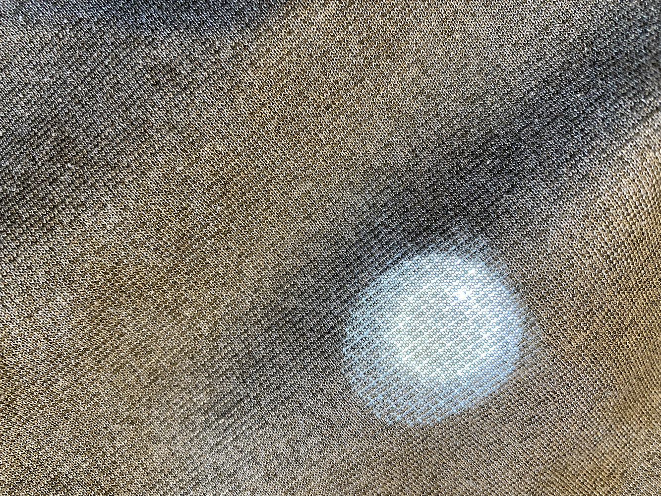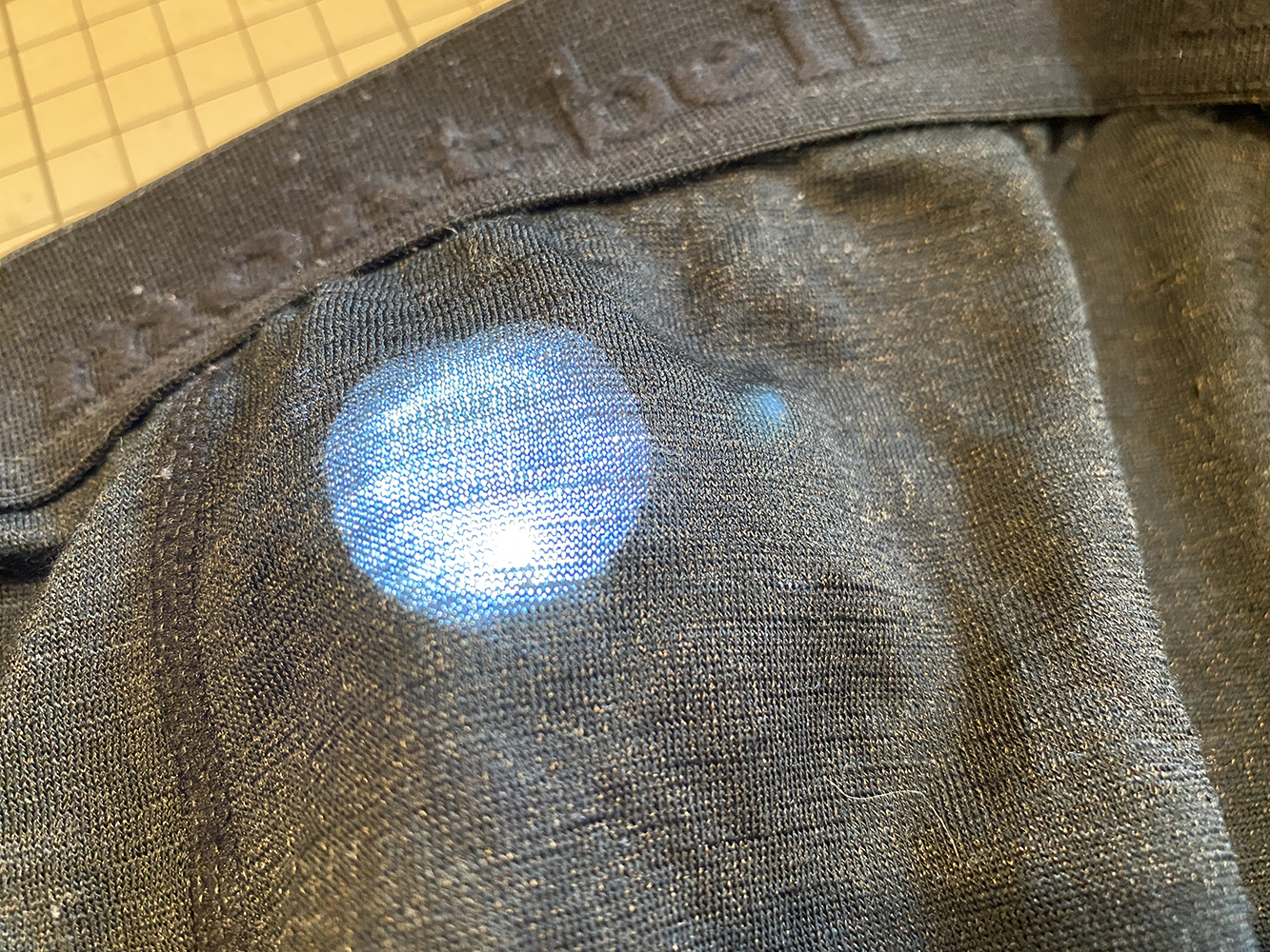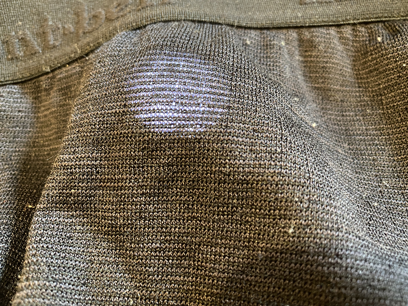 ライトの透過具合で、分かると思いますが、全体に生地が厚いのです。寒い時しか履かない。でも、冬場、これを着た上にショートパンツを履いて家で過ごすのはちょうど良いです。一番薄いやつの3倍くらいの厚さに感じます(個人比)