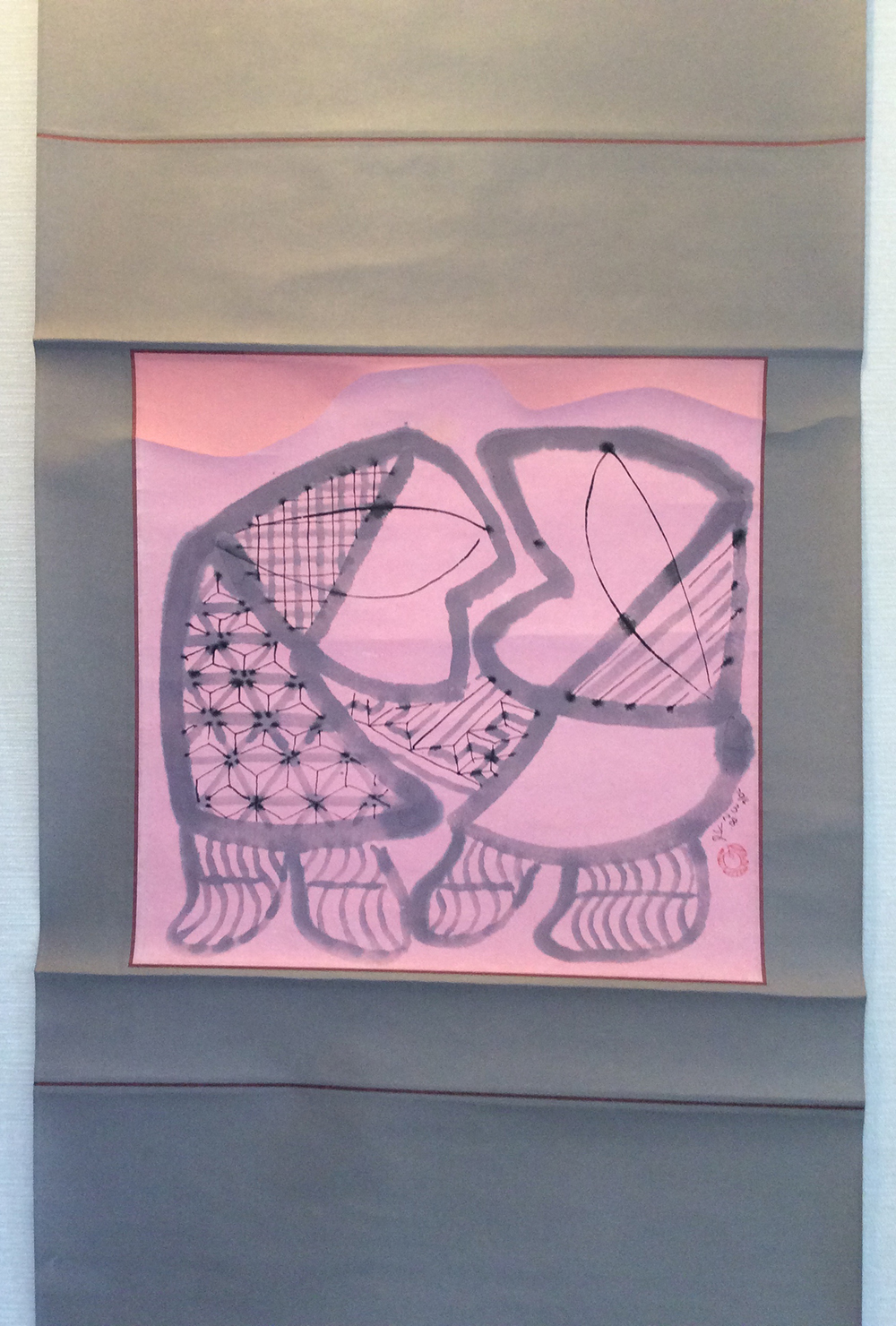 下は、北国の定番・角巻(かくまき)※を巻いた人物の墨絵で、掛け軸になっている。
