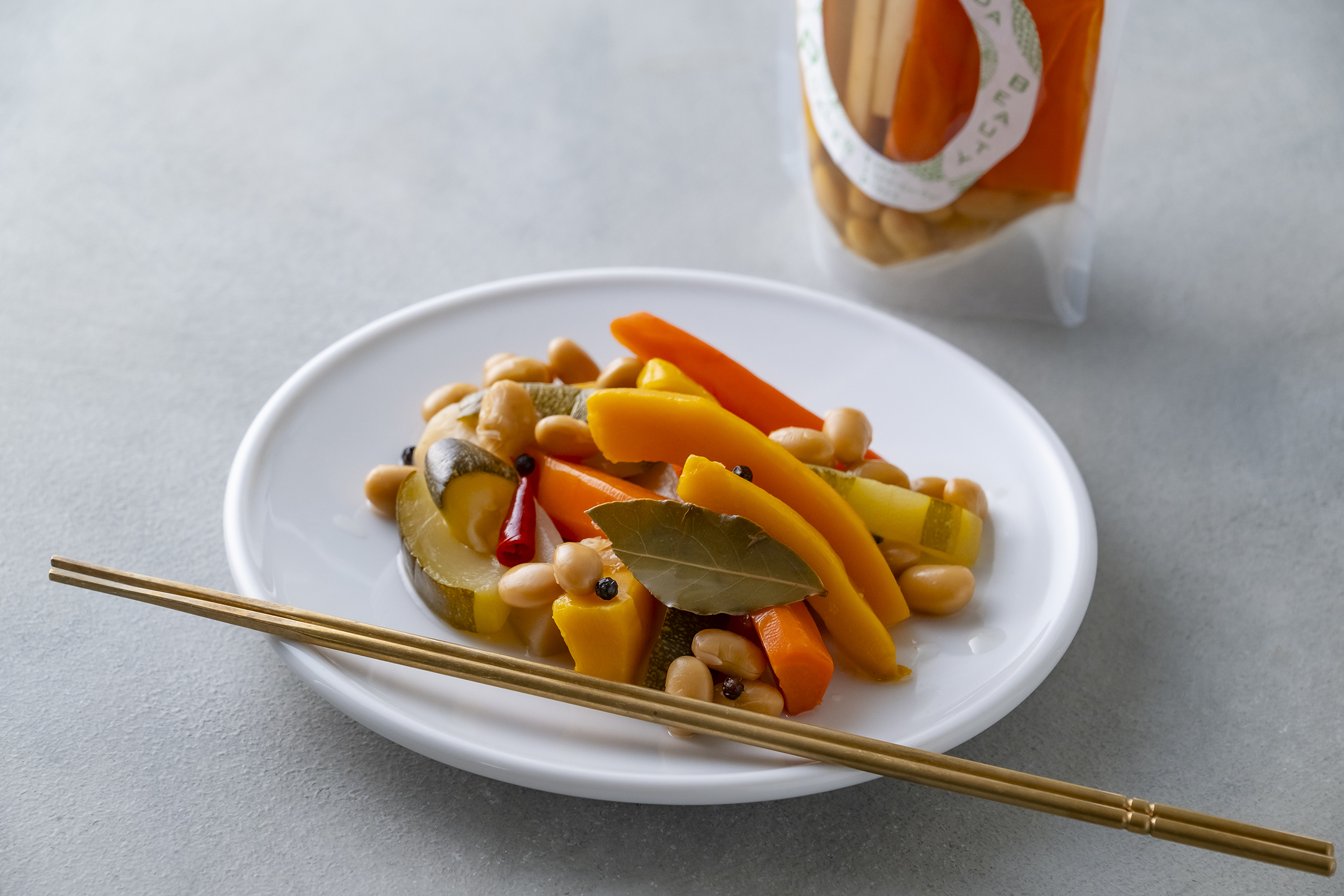 十和田市産のごぼう、にんじん、ズッキーニ、コリンキー、大豆の食感とリンゴ酢のバランスが良く、スパイシーなピクルスです。
