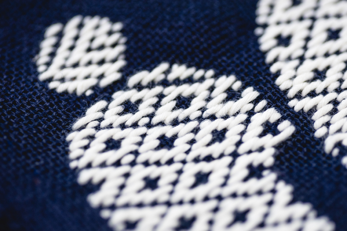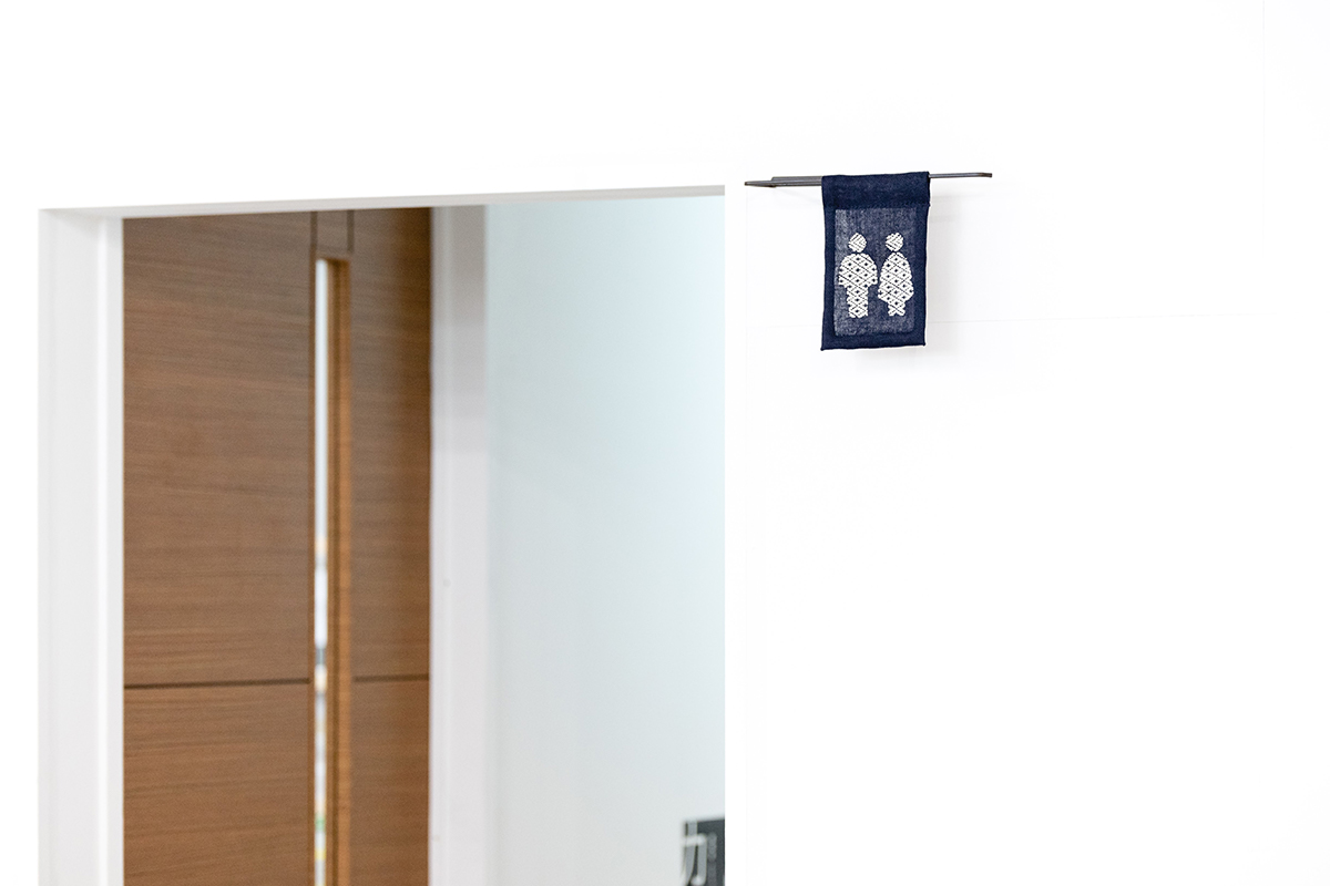 十和田に新しくできた施設14-54の玄関サインとトイレサインをデザインした。 土地のモノを上手に使いたかったので、南部菱刺しを利用したサインを考えた。 一見、遠くからでは気がつかないが、近くまで来ると、それが刺繍であることがわかる。 この土地に古くから存在している文化(民芸)と新しく移住してきたアメリカ人の二人が作るこの空間。 ここでこれから作り出されていく新しいハーモニーが、 うまく調和していると思う。