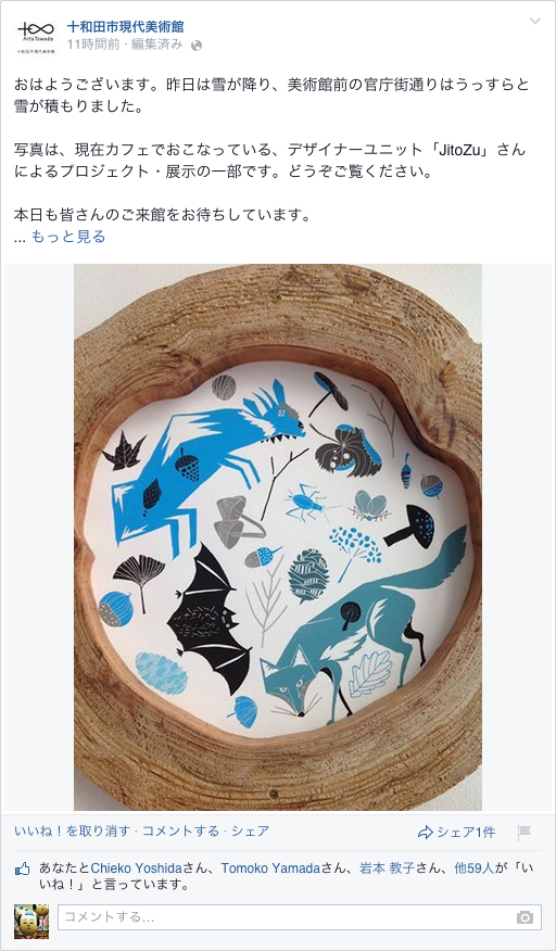 info 私たちJItoZu(じとず)の展示が、十和田市現代美術館にて、開催中。 jitozu_zu 2014年12月4日 / 2023年10月9日 投稿 by 十和田市現代美術館. 《関連する記事》三沢の新しいカフェ『餃子かふぇOHAKO(オハコ)』のデザインを字と図が担当しました事業案内パンフレットとキャラクターデザイン|RootタモリさんがNHKみんなのうたで歌っていた『ミスターシンセサイザー』ドイツと十和田市で中継対談をしました。子育ての事を中心に話すデザイナーとイラストレーターのパパ対談。まだ鼻をかめない小さいお子さんや赤ちゃんの鼻詰まりや鼻掃除にオススメの道具1選。花粉やアレルギー、耳管狭窄症にも効果的。東京から友達が1泊旅行に来たので、十和田の面白スポット観光ツアーを企画してみた!〈後編〉坂本梨奈【Me】CDパッケージデザイン[課外活動]映画館のない町で、映画を上映するイベントにデザイナーの分際で初出店してみた(その3)酒BAR_つなぐ_ロゴマーク+ツールデザイン夏の記憶|はじめて流しそうめんという装置を作ってみた #流しそうめん[隠れ百景]に認定したい“青森県三沢市にある寺山修司記念館の裏山”が最高の絶景。フェアリーロード2014のDMできました![星野リゾート奥入瀬渓流ホテル × 十和田市現代美術館 × JItoZU]