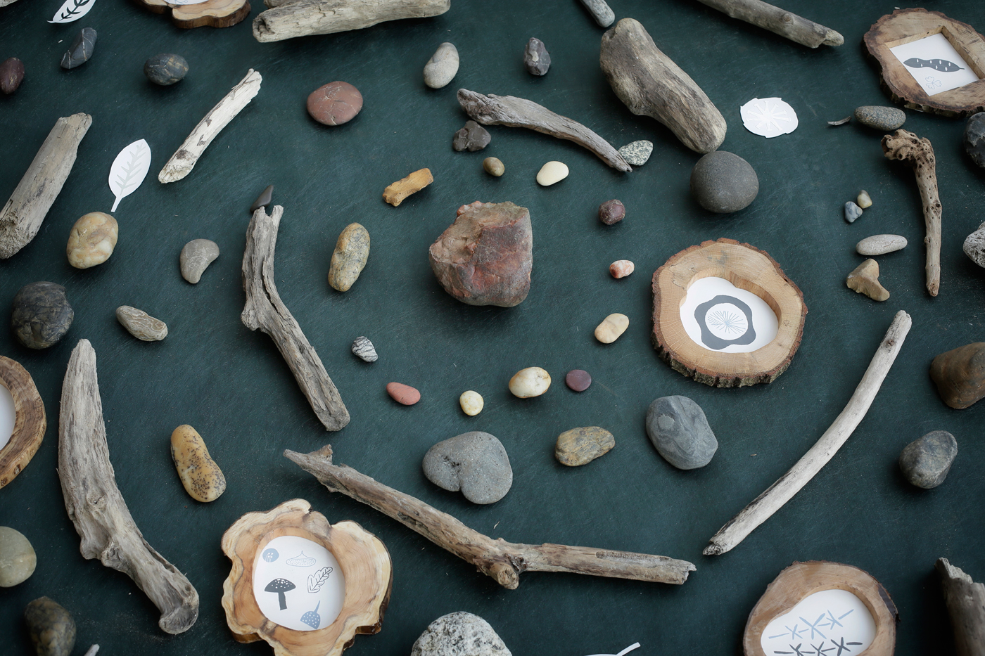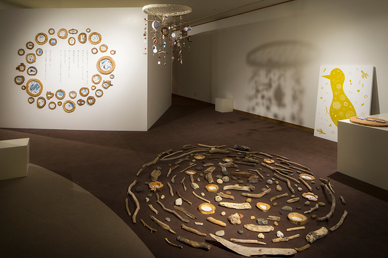 その仕組みも、キューブのオーナメントも、壁面にかけた木の額装も、配置した石や枝も、全てサークル(輪)がテーマになっている。