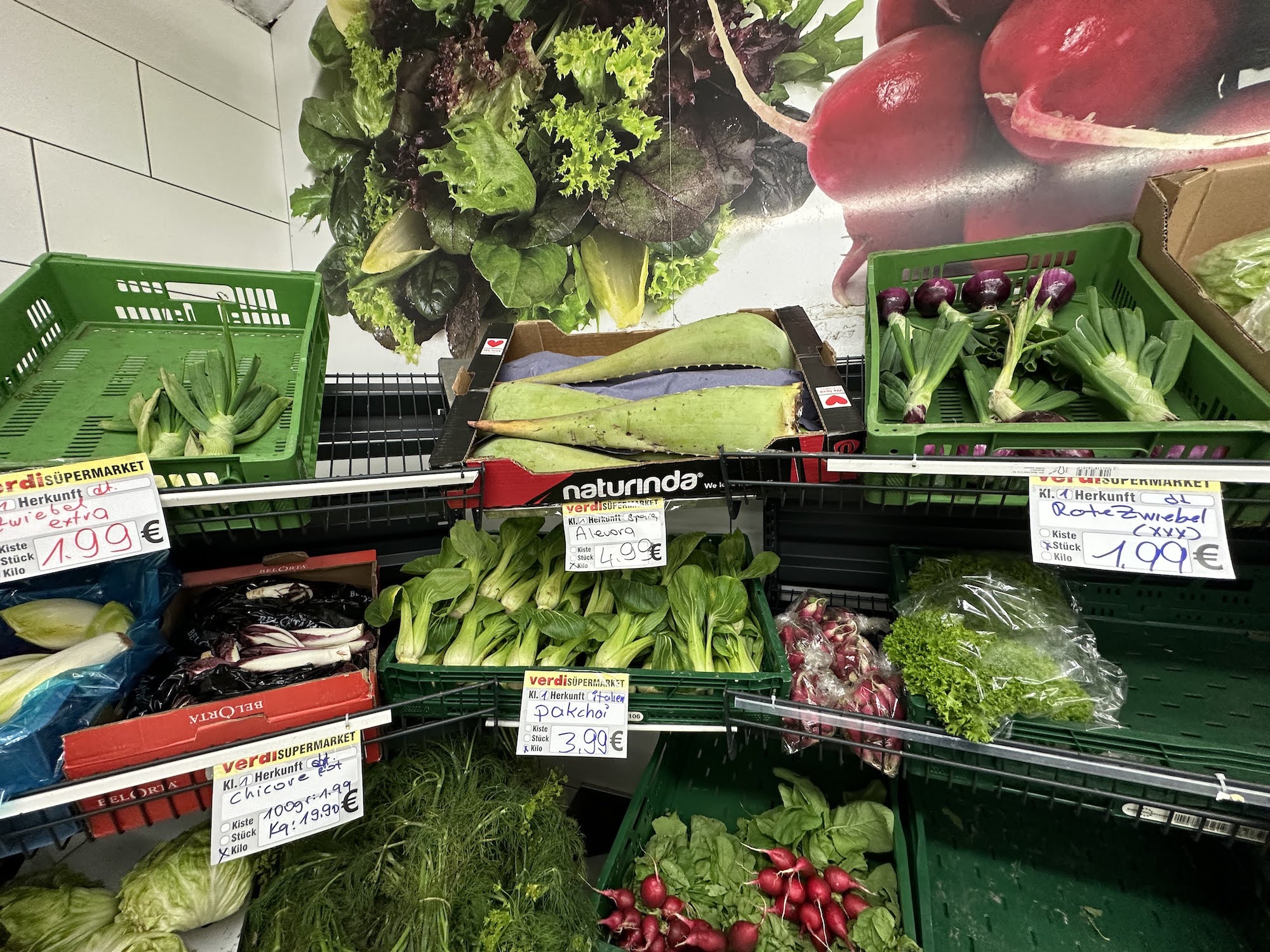特にお気に入りだというスーパーVerdi Supermarkt GmbHでは、野菜が新鮮でお安い。