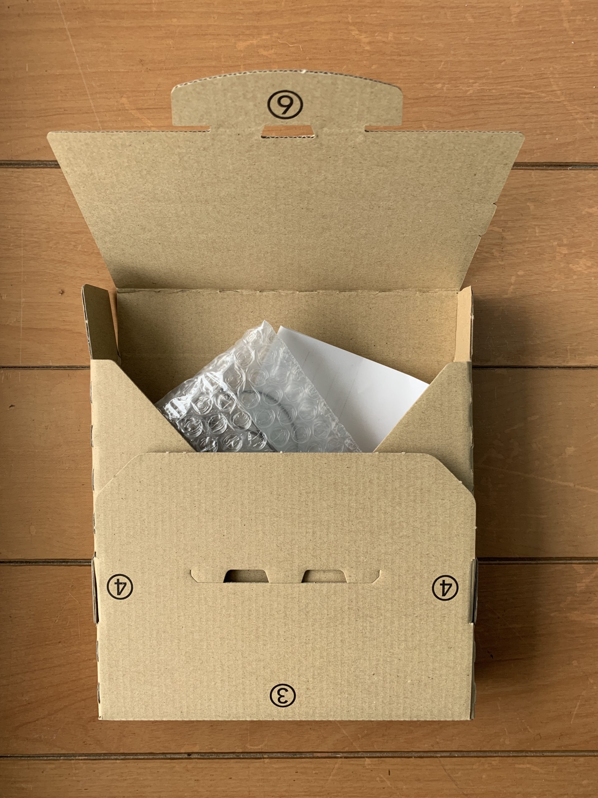 2月12日に「メガネが到着しました!」という内容のお知らせがきて、納品は2月27日〜3月1日になると書いてあり、結構かかるなーと残念に思っていましたが、なぜか18日に到着!