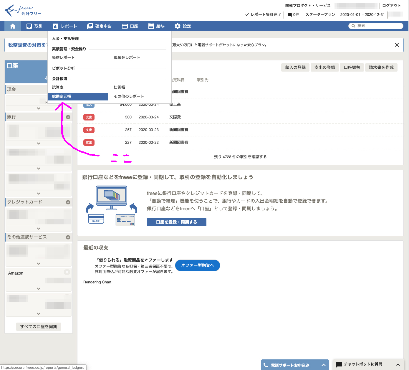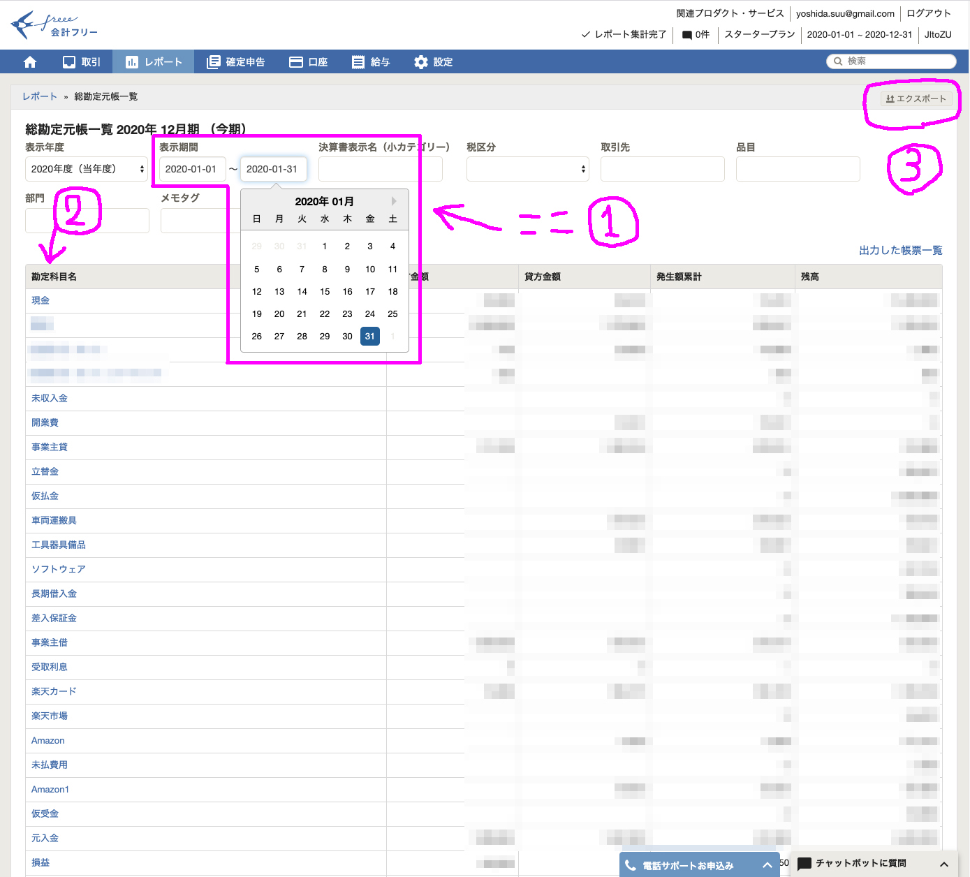 freeeユーザー向けの情報なのですが、持続化給付金の支給の申請に必要な売上台帳、税理士に確認したところ、売上の総勘定元帳で良いと回答あり。メニューから「レポート」⇒「総勘定元帳」と進み、売上高をクリックすると売上高の総勘定元帳が表示されます。その後エクスポートで帳票を出力できます。