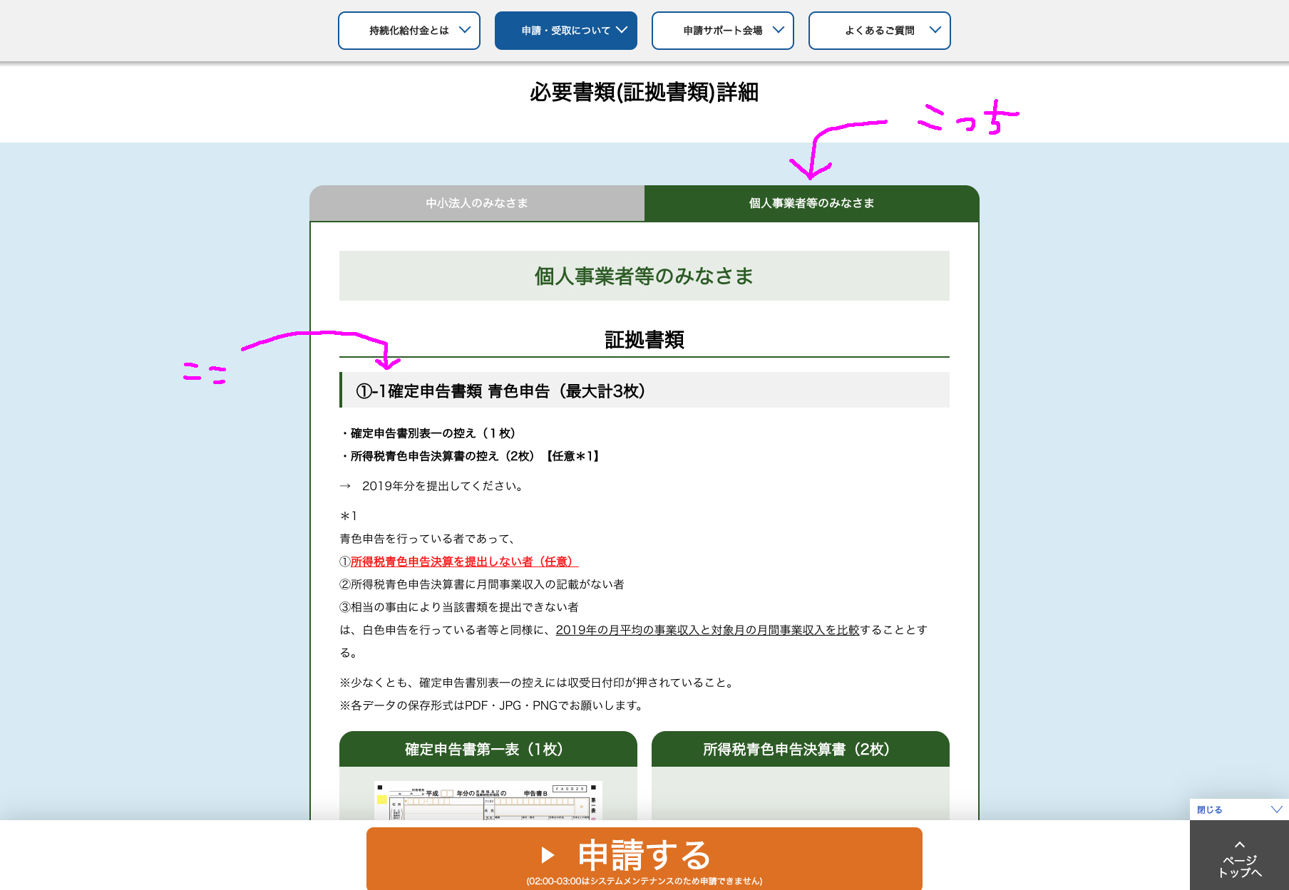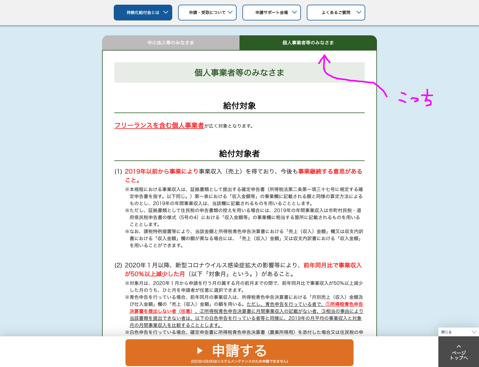 上部に2つのタブがあるので、右側『個人事業者等のみなさま』をクリックします。